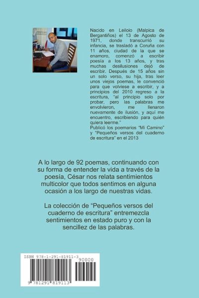 A lo largo de 92 poemas, continuando con su forma de entender la vida a través de la poesía, César nos relata sentimientos multicolor que todos sentimos en alguna ocasión a los largo de nuestras vidas. La colección de "Pequeños versos del cuaderno de escritura" entremezcla sentimientos en estado puro y con la sencillez de las palabras.