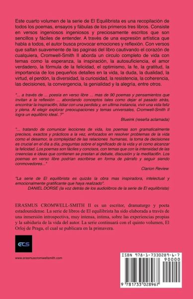 Este cuarto volumen de la serie de El Equilibrista es una recopilación de todos los poemas, ensayos y fabulas de los primeros tres libros. Consiste en unos versos ingeniosos preciosamente escritos que son sencillos y fáciles de entender. A través de una expresión artística que habla a todos, el autor busca provocar emociones y reflexión. Con versos que saltan suavemente de las paginas del libro cautivando el corazón de cualquiera, Cromwell-Smith II aborda un círculo completo de vida con temas como la esperanza, la inspiración, la autosuficiencia, el amor verdadero, la fórmula de la felicidad, el optimismo, la fe, la gratitud, la importancia de los pequeños detalles en la vida, la duda, la dualidad, la virtud, el perdón, la diversidad, la curiosidad, la resistencia, la coherencia, las decisiones, la convergencia, la genialidad y la alegría, entre otros.