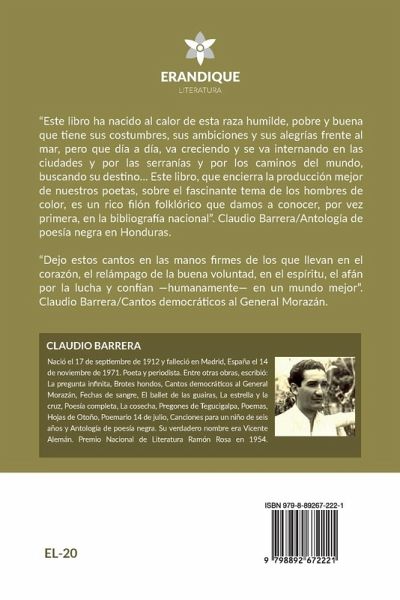 "Este libro ha nacido al calor de esta raza humilde, pobre y buena que tiene sus costumbres, sus ambiciones y sus alegrías frente al mar, pero que día a día, va creciendo y se va internando en las ciudades y por las serranías y por los caminos del mundo, buscando su destino... Este libro, que encierra la producción mejor de nuestros poetas, sobre el fascinante tema de los hombres de color, es un rico filón folklórico que damos a conocer, por vez primera, en la bibliografía nacional". Claudio Barrera/Antología de poesía negra en Honduras. "Dejo estos cantos en las manos firmes de los que llevan en el corazón, el relámpago de la buena voluntad, en el espíritu, el afán por la lucha y confían -humanamente- en un mundo mejor". Claudio Barrera/Cantos democráticos al General Morazán.