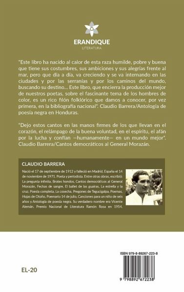 "Este libro ha nacido al calor de esta raza humilde, pobre y buena que tiene sus costumbres, sus ambiciones y sus alegrías frente al mar, pero que día a día, va creciendo y se va internando en las ciudades y por las serranías y por los caminos del mundo, buscando su destino... Este libro, que encierra la producción mejor de nuestros poetas, sobre el fascinante tema de los hombres de color, es un rico filón folklórico que damos a conocer, por vez primera, en la bibliografía nacional". Claudio Barrera/Antología de poesía negra en Honduras. "Dejo estos cantos en las manos firmes de los que llevan en el corazón, el relámpago de la buena voluntad, en el espíritu, el afán por la lucha y confían -humanamente- en un mundo mejor". Claudio Barrera/Cantos democráticos al General Morazán.