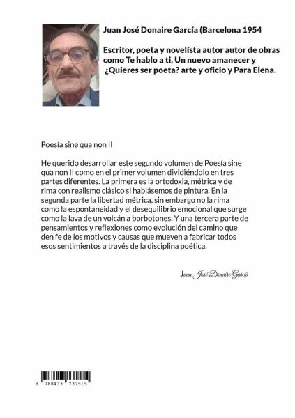 Poesía sine qua non II He querido desarrollar este segundo volumen de Poesía sine qua non II como el primer volumen dividiéndolo en tres partes diferentes. La primera es la ortodoxia, métrica y de rima con realismo clásico si hablásemos de pintura. En la segunda parte la libertad métrica, sin embargo no la rima como la espontaneidad y el desequilibrio emocional que surge como la lava de un volcán a borbotones. Y una tercera parte de pensamientos y reflexiones como evolución del camino que den fe de los motivos y causas que mueven a fabricar todos esos sentimientos a través de la disciplina poética.