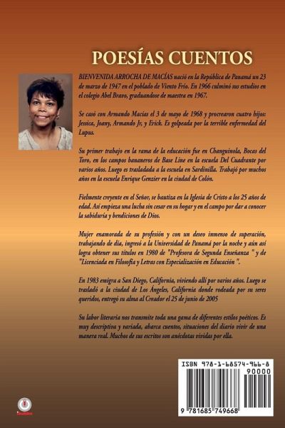 BIENVENIDA ARROCHA DE MACÍAS nació en la República de Panamá un 23 de marzo de 1947 en el poblado de Viento Frío. En 1966 culminó sus estudios en el colegio Abel Bravo, graduándose de maestra en 1967. Se casó con Armando Macías el 3 de mayo de 1968 y procrearon cuatro hijos: Jessica, Joany, Armando Jr, y Erick. Es golpeada por la terrible enfermedad del Lupus. Su primer trabajo en la rama de la educación fue en Changuinola, Bocas del Toro, en los campos bananeros de Base Line en la escuela Del Cuadrante por varios años. Luego es trasladada a la escuela en Sardinilla. Trabajó por muchos años en la escuela Enrique Genzier en la ciudad de Colón. Fielmente creyente en el Señor, se bautiza en la Iglesia de Cristo a los 25 años de edad. Así empieza una lucha sin cesar en su hogar y en el campo por dar a conocer la sabiduría y bendiciones de Dios. Mujer enamorada de su profesión y con un deseo inmenso de superación, trabajando de día, ingresó a la Universidad de Panamá por la noche y aún así logra obtener sus títulos en 1980 de "Profesora de Segunda Enseñanza " y de "Licenciada en Filosofía y Letras con Especialización en Educación ". En 1983 emigra a San Diego, California, viviendo allí por varios años. Luego se trasladó a la ciudad de Los Ángeles, California donde rodeada por su seres queridos, entregó su alma al Creador el 25 de junio de 2005. Su labor literaria nos transmite toda una gama de diferentes estilos poéticos. Es muy descriptiva y variada, abarca cuentos, situaciones del diario vivir de una manera real. Muchos de sus escritos son anécdotas vividas por ella.