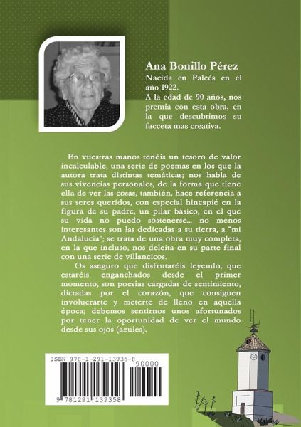 Ana Bonillo Pérez, escritora que a sus 90 años, nos premia con esta obra llena de sentimiento, de ilusión y de fuerza, testimonio para todos del incalculable valor de aquellos años. Esta edición, largo tiempo esperada, cobija el alma de su tierra y sus pasiones, que se reúnen en 42 poesías de su puño y letra.