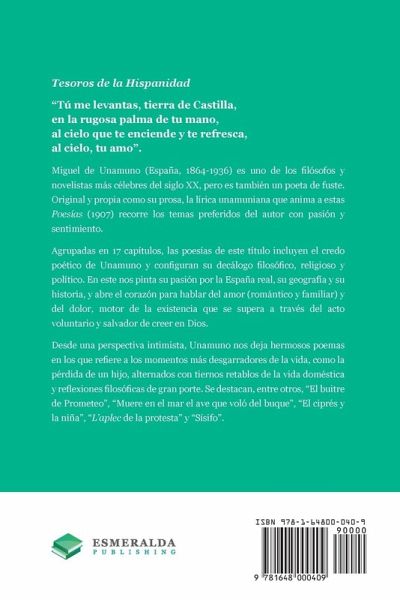 Tesoros de la Hispanidad "Tú me levantas, tierra de Castilla, en la rugosa palma de tu mano, al cielo que te enciende y te refresca, al cielo, tu amo". Miguel de Unamuno (España, 1864-1936) es uno de los filósofos y novelistas más célebres del siglo XX, pero es también un poeta de fuste. Original y propia como su prosa, la lírica unamuniana que anima a estas Poesías (1907) recorre los temas preferidos del autor con pasión y sentimiento. Agrupadas en 17 capítulos, las poesías de este título incluyen el credo poético de Unamuno y configuran su decálogo filosófico, religioso y político. En este nos pinta su pasión por la España real, su geografía y su historia, y abre el corazón para hablar del amor (romántico y familiar) y del dolor, motor de la existencia que se supera a través del acto voluntario y salvador de creer en Dios. Desde una perspectiva intimista, Unamuno nos deja hermosos poemas en los que refiere a los momentos más desgarradores de la vida, como la pérdida de un hijo, alternados con tiernos retablos de la vida doméstica y reflexiones filosóficas de gran porte. Se destacan, entre otros, "El buitre de Prometeo", "Muere en el mar el ave que voló del buque", "El ciprés y la niña", "L'aplec de la protesta" y "Sísifo". Heir of Søren Kierkegaard and a precursor of continental existentialism, Miguel de Unamuno (Spain, 1864-1936) is one of the main European philosophers of the 20th century, and an outstanding Generation of '98 author. Best known by his prose, Unamuno is also a consummate poet, and in Poesías he showcases his masterful skill, as well as his philosophical, religious, and political worldview. Romantic and familiar love, the travails of existence, and faith, as well as many other Existential leitmotifs, are present in this work.