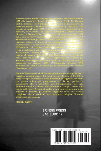 Erminia Passannanti, vincitrice del primo premio "FRANCO FORTINI" per la sezione saggistica, si distingue per la consapevolezza dei nessi interni all'opera di Fortini, in senso lato (per i numerosi e densi riferimenti al saggista), ma anche per quanto attiene più propriamente al discorso poetico: la Passannanti, oltre a cimentarsi con l'interpretazione dei versi fortiniani ormai da diversi anni (rammento l'ampio lavoro sulla Poesia delle rose), è poeta di vaglia, e non stupisce pertanto la sua capacità di tradurre gli elementi linguistici entro una cornice complessa, che si avvale di una ravvicinata indagine di ordine psicologico-esistenziale. (Dall'Introduzione di Luca Lenzini)