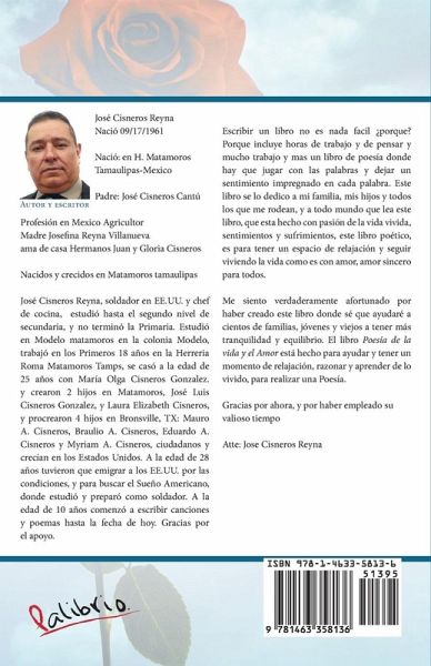 Escribir un libro no es nada facil porque? Porque incluye horas de Trabajo y de pensar y mucho Trabajo y mas un libro de poesía donde hay que Jugar con las palabras y dejar un sentimiento inpregnado en cada palabra. Este libro se lo dedico a mi familia, mis hijos y Todos los que me rodean, y a Todo mundo que lea este libro, que esta hecho con pasion de la vida vivida, sentimientos y sufrimientos, este libro poetico, es para tener un espacio de relajacion y seguir viviendo la vida como es con Amor, Amor sincero para Todos Me siento verdaderamente Afortunado Por Aver creado este libro donde Se que Ayudare a cientos de familias Jovenes y viejos a tener mas tranquilidad Y Equilibrio en la vida Poesia de la vida y el Amor esta Hecho para Ayudar y Tener un momento de relajacion Razonar y Aprender de lo vivido Para realizar una Poesia Gracias por ahora, y por Aver Empleado su valioso Tiempo Atte: Jose Cisneros Reyna