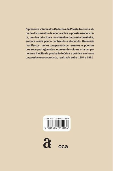 The present volume of Cadernos de Poesia brings a series of period documents about neoconcrete poetry, one of the main movements in Brazilian poetry, although it is still little known and discussed. Bringing together manifestos, programmatic texts, essays and poems by its protagonists, this volume creates an unprecedented panorama of the theoretical and poetic production around neoconcrete poetry, which took place between 1957 and 1961.