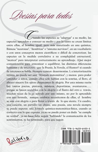 Cuando las especies se "adaptan" a su medio, las especies aprenden a conocer su medio y por lo tanto se crean límites entre ellas, al hombre igual, pero más sintetizado en una química, llámese "neuronas", "dendritas" o "sistema nervioso", en un vocabulario o con unos conceptos menos científicos o difícil de concretizar, las especies en la medida correlativa a su complejidad estructural, "sienten" para interpretar correctamente su aprendizaje. ¿Qué mejor comunicación para armonizar o equilibrar, las distintas diferencias humanas y de intereses, que la Poesía, la Novela, el Humor? si cuando de intereses se habla. Siempre existen desarmonías. L a interiorización intima, no puede ser una "fórmula matemática", y menos para poder entender a niños, cuando ellos solo hablan con la sonrisa, el lloro, el abrazo sincero los ojitos chispeantes de alegría. Por esta misma razón hay tantos poetas, pintores, músicos, deportistas, aventureros......porque se hacen sociables con la alegría o el llanto del otro a través, muchas veces de lo ya sentido por uno mismo, no por lo aprendido con una formula, aunque también necesitemos de ellas, el hombre se une con alegría o para llorar a través de lo que siente. Un cuadro, una canción, un partido, un chiste, una poesía, una novela siempre se puede superar, una formula quimica-matemática-física, cuando es correcta con lo que expresa, ya no se puede poner en duda "se cumple su verdad", ya no hace falta seguir "hablando" la comunicación de los sentimientos, se ha terminado, para que seguir.