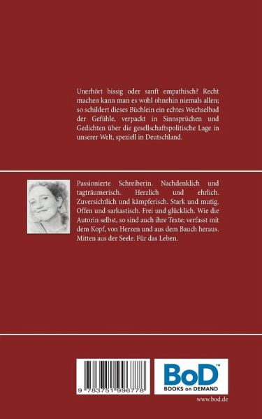 Unerhört bissig oder sanft empathisch? Recht machen kann man es wohl ohnehin niemals allen; so schildert dieses Büchlein ein echtes Wechselbad der Gefühle, verpackt in Sinnsprüchen und Gedichten über die gesellschaftspolitische Lage in unserer Welt, speziell in Deutschland.