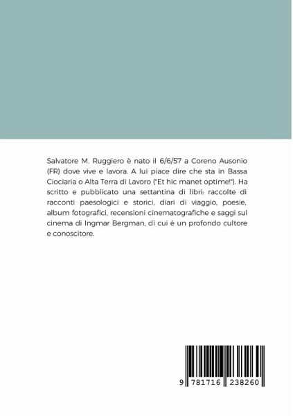 Salvatore M. Ruggiero è nato il 6/6/57 a Coreno Ausonio (FR) dove vive e lavora. A lui piace dire che sta in Bassa Ciociaria o Alta Terra di Lavoro ("Et hic manet optime!"). Ha scritto una settantina di libri: raccolte di racconti paesologici e storici, diari di viaggio, poesie, recensioni cinematografiche e saggi sul cinema di Ingmar Bergman, di cui è un profondo cultore e conoscitore.