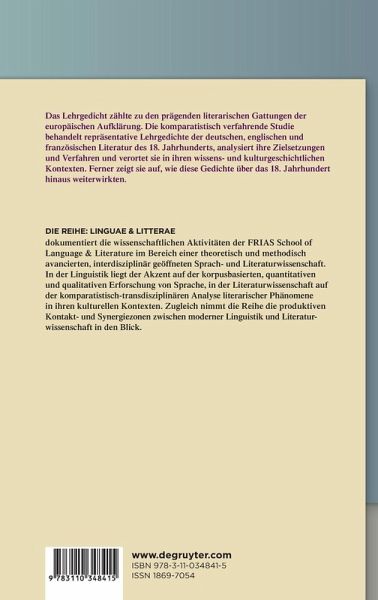 Das Lehrgedicht des 18. Jahrhunderts gilt als eine der charakteristischen literarischen Erscheinungen der Aufklärung, hat in der Forschung aber nur wenig Aufmerksamkeit gefunden. So gibt es bisher noch keine komparatistische Untersuchung dieses Gegenstands, obwohl bekannt ist, dass viele Lehrgedichte international eine große Wirkung ausübten. Die Studie nimmt sich dieses Desiderats an und analysiert repräsentative Lehrgedichte der deutschen, englischen und französischen Literatur; die Reihe der behandelten Autoren reicht von John Dryden bis Johann Wolfgang von Goethe. Die leitenden Fragen zielen auf die rhetorischen Verfahren der Gedichte, auf ihre Arten der Wissensverarbeitung und auf ihre prägenden Kontexte. Die Arbeit zeigt, dass das Lehrgedicht jener Zeit nicht, wie oft angenommen wird, in erster Linie ein Instrument der Popularisierung philosophischen und wissenschaftlichen Wissens war. In seinen einflussreichsten Manifestationen gestaltete es vielmehr den Anspruch des Einzelnen, selbstständig eine sinnstiftende Deutung des Weltganzen zu entwerfen. Damit eröffnet die Studie auch eine neue Sicht auf die Beziehung zwischen dem Lehrgedicht des 18. Jahrhunderts und der um 1800 aufkommenden philosophischen Lyrik.