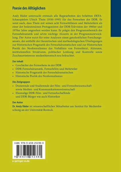 Andy Räder untersucht erstmals alle Regiearbeiten des beliebten DEFA-Schauspielers Ulrich Thein (1930-1995) für das Fernsehen der DDR. Er weist nach, dass Thein mit seinen acht Fernsehfilmen und Mehrteilern als einer der bedeutendsten Protagonisten der DDR-Television der 1960er und 1970er Jahre angesehen werden kann. Er prägte den Programmbereich der Fernsehdramatik und setzte wichtige Akzente in der Programmentwicklung. Der Autor nutzt für seine Analysen einen ganzheitlichen Forschungsansatz, der mithilfe der theoretischen und methodologischen Überlegungen zur Historischen Pragmatik des Fernsehdramatischen und zur Historischen Poetik des Neoformalismus das Verhältnis von Fernsehtext, Akteuren, institutionellen Strukturen, politischer Lenkung und Kontrolle sowie Zuschauerinteresse medienhistorisch neu beleuchtet.