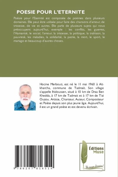 Poésie pour l'Eternité est composée de poèmes dans plusieurs domaines. Elle peut être utilisée pour faire des chansons d'amour, de tristesse, de vie et autres. Elle parle de plusieurs sujets qui nous préoccupent aujourd'hui, exemple : les conflits, les guerres, l'Humanité, le social, l'amour, la tristesse, la politique, la trahison, la pauvreté, les maladies, la solidarité, la patrie, la mort, le sport, le mariage et beaucoup d'autres choses.