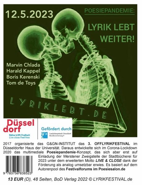 Das Buch und eBook zur Lesung! POESIEPANDEMIE LIVE & CLOSE: "LYRIK LEBT WEITER!"2017 organisierte das G&GN-INSTITUT (g-gn.de) nach 20 Jahren Pause das 3.OFFLYRIKFESTIVAL im Düsseldorfer Haus der Universität. Daraus entwickelte sich im Corona-Lockdown 2020 das multimediale Poesiepandemie-Konzept, das sich aber erst auf Einladung der Werstener Zweigstelle der Stadtbücherei für 2023 unter dem erweiterten Motto LIVE & CLOSE dank der Förderung als analog umsetzbar erwies. Es basiert auf dem Autorenpool des Festivalforums im Poesiesalon.de Das erste 4er-Team besteht aus den folgenden Autoren:Marvin Chlada (_1970) aus Duisburg.Harald Kappel (_1960) aus Aachen.Boris Kerenski (_1971) aus Stuttgart.Tom de Toys (_1968) aus Jülich.www.LyrikLebt.de