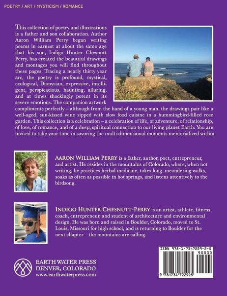 POESIS: flowing along a river of time is a collection of poetry written by Aaron William Perry and illustrated by his son Indigo Hunter Chesnutt-Perry. Covering a quarter century, from Aaron's adolescent years to his early forties, this collection of poems is a woven tapestry with many rich themes: nature, mysticism, love, culture, and travel. It reflects a deep appreciation for life, for Earth, for intimacy and sumptuous aesthetics. In this collection, you'll find references to poets like Gary Snyder (Japhy), musicians like John Coltrane, and commemorations of places like the desert southwest, the Rocky Mountains, Greenwich Village in New York City, the Adirondacks, the Puget Sound, the Austrian Alps, Paris, Florence, Corsica, and the Scottish heath. You'll also be granted a glimpse of some very intimate and emotional pieces related to romantic love, loss, and a deep, mystical connection with the life force and natural intelligence suffusing creation. The illustrations, created during his high school years, reveal Hunter's refined technical detail, eye for shape, color, composition, and visual flow, and combine a variety of themes, media, and stylistic expressions. His pieces range from detailed pencil to water color, and from colorful montage to stark monochromatic abstractions. This special project is a father-son collaboration, that celebrates their enduring love, their love of collaboration, and Hunter's high school graduation and transition into adulthood.