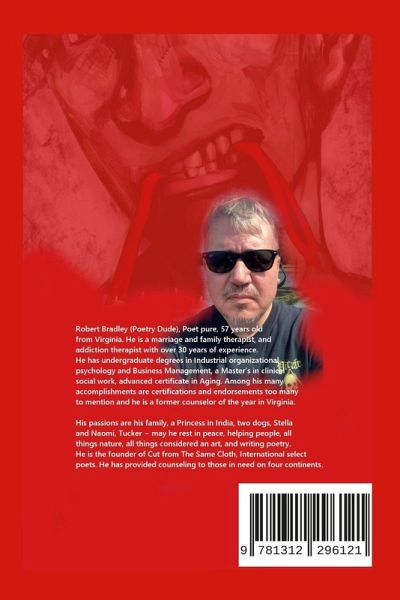 Robert Bradley (Poetry Dude), Poet pure, 57 years old from Virginia. He is a marriage and family therapist, and addiction therapist with over 30 years of experience. He has undergraduate degrees in Industrial organizational psychology and Business Management, a Master's in clinical social work, advanced certificate in Aging. Among his many accomplishments are certifications and endorsements too many to mention and he is a former counselor of the year in Virginia. His passions are his family, a Princess in India, two dogs, Tucker and Stella, helping people, all things nature, all things considered an art, and writing poetry. He is the founder of Cut from The Same Cloth, International select poets. He has provided counseling to those in need on four continents.