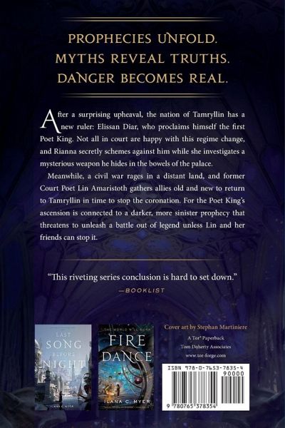 Prophecies unfold, legends turn real, and a war of mythical proportions endangers the realm in Ilana C. Myer's epic fantasy The Poet King, the follow-up to her critically-acclaimed Fire Dance, continuing The Harp and Ring Sequence. After a surprising upheaval, the nation of Tamryllin has a new ruler: Elissan Diar, who proclaims himself the first Poet King. Not all in court are happy with this regime change, as Rianna secretly schemes against him while she investigates a mysterious weapon he hides in the bowels of the palace. Meanwhile, a civil war rages in a distant land, and former Court Poet Lin Amaristoth gathers allies old and new to return to Tamryllin in time to stop the coronation. For the Poet King's ascension is connected with a darker, more sinister prophecy which threatens to unleash a battle out of legend unless Lin and her friends can stop it.