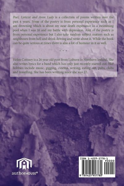 Poet, Lyricist and Avon Lady is a collection of poems written over the past 4 years. Some of the poetry is from personal experience such as I am drowning which is about my near death experience in a swimming pool when I was 16 and my battle with depression. Alot of the poetry is from personal experience but I also take random subject matters such as neighbours from hell and drink driving and write about it. While the book can be quite serious at times there is also a lot of humour in it as well.