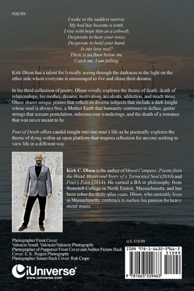 I wake to the saddest sunrise. My bed has become a tomb. I rise with hope thin as a cobweb, Desperate to hear your voice, Desperate to hold your hand. Is our love real? There is no floor below me. Catch me, I am falling. Kirk Olson has a talent for lyrically seeing through the darkness to the light on the other side where everyone is encouraged to live and chase their dreams. In his third collection of poetry, Olson vividly explores the theme of death: death of relationships, his mother, dreams, motivation, accidents, addiction, and much more. Olson shares unique poems that reflect on diverse subjects that include a dark knight whose soul is always free, a Mother Earth that humanity continues to deface, guitar strings that scream postulation, subconscious wanderings, and the death of a romance that was never meant to be. Poet of Death offers candid insight into one man's life as he poetically explores the theme of dying within an open platform that inspires reflection for anyone seeking to view life in a different way.