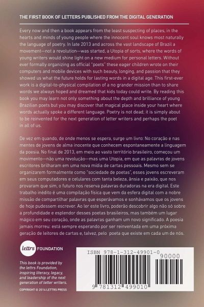 Every now and then a book appears from the least suspecting of places, in the hearts and minds of young people where the innocent soul knows most naturally the language of poetry. In late 2013 and across the vast landscape of Brazil a movement-not a revolution-was started, a Utopia of sorts, where the words of young writers would shine light on a new medium for personal letters. Without ever formally organizing as official "poets" these eager children wrote on their computers and mobile devices with such beauty, longing, and passion that they showed us what the future holds for lasting words in a digital age. This first-ever work is a digital-to-physical compilation of a no grander mission than to share words we always hoped and dreamed that kids today could write.