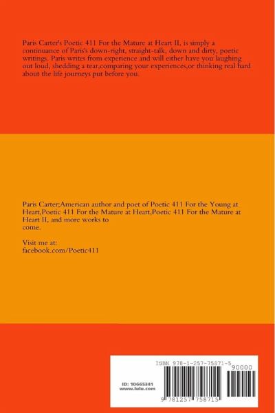 Poetic 411 For the Mature at Heart II is a collection of poetry for the mature-minded. Real Talk. No beating around the bush. Straight talk which speaks on love, sex, commitment, and infidelity.