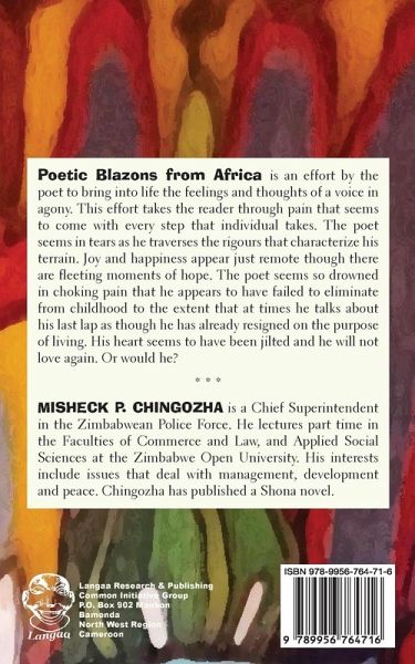 Poetic Blazons from Africa is an effort by the poet to bring into life the feelings and thoughts of a voice in agony. This effort takes the reader through pain that seems to come with every step that individual takes. The poet seems in tears as he traverses the rigours that characterize his terrain. Joy and happiness appear just remote though there are a fleeting moments of hope. The poet seems so drowned in choking pain that he appears to have failed to eliminate from childhood to the extent that at times he talks about his last lap as though he has already resigned on the purpose of living. His heart seems to have been jilted and he will not love again. Or would he?