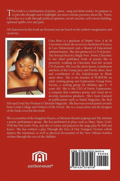 This book is a combination of poetry, prose, song and short stories. Its purpose is to provoke thought and to highlight our most extreme passions about life. Poetic Chocolate is a walk through political opinions, social concerns, self-esteem building, spiritual uplifts, love and pain. All characters in this book are fictional and are based on the author's imagination and creativity.