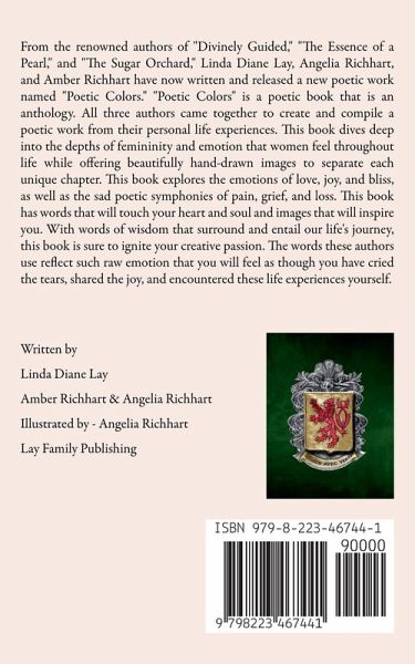 From the renowned authors of "Divinely Guided," "The Essence of a Pearl," and "The Sugar Orchard," Linda Diane Lay, Angelia Richhart, and Amber Richhart have now written and released a new poetic work named "Poetic Colors." "Poetic Colors" is a poetic book that is an anthology, where all three authors came together to create and compile a poetic work from their personal life experiences. This book dives deep into the depths of femininity and emotions that women feel throughout life while offering beautifully hand-drawn images. This book explores the emotions of love, joy, and bliss, as well as the sad poetic symphonies of pain, grief, and loss. This book has words that will touch your heart and soul and images that will inspire you. "Poetic Colors" is a poetry book that has words of wisdom that surround and entail our life's journey; this book is sure to ignite your creative passion. The words these authors use reflect such raw emotion that you will feel as though you have cried the tears, shared the joy, and encountered these life experiences yourself. This book has so much emotion engulfed into its pages that anyone who reads the words from this book could somehow relate it to their own personal life experiences.