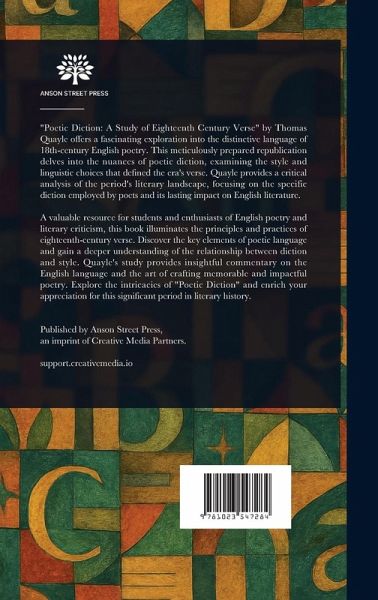 "Poetic Diction: A Study of Eighteenth Century Verse" by Thomas Quayle offers a fascinating exploration into the distinctive language of 18th-century English poetry. This meticulously prepared republication delves into the nuances of poetic diction, examining the style and linguistic choices that defined the era's verse. Quayle provides a critical analysis of the period's literary landscape, focusing on the specific diction employed by poets and its lasting impact on English literature. A valuable resource for students and enthusiasts of English poetry and literary criticism, this book illuminates the principles and practices of eighteenth-century verse. Discover the key elements of poetic language and gain a deeper understanding of the relationship between diction and style. Quayle's study provides insightful commentary on the English language and the art of crafting memorable and impactful poetry. Explore the intricacies of "Poetic Diction" and enrich your appreciation for this significant period in literary history. This work has been selected by scholars as being culturally important, and is part of the knowledge base of civilization as we know it. This work is in the public domain in the United States of America, and possibly other nations. Within the United States, you may freely copy and distribute this work, as no entity (individual or corporate) has a copyright on the body of the work. Scholars believe, and we concur, that this work is important enough to be preserved, reproduced, and made generally available to the public. We appreciate your support of the preservation process, and thank you for being an important part of keeping this knowledge alive and relevant.