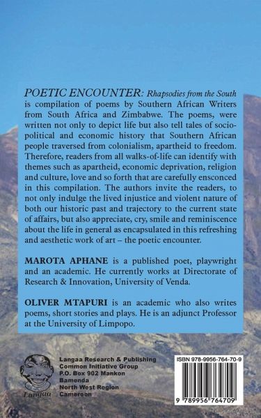 Poetic encounter: Rhapsodies from the South is compilation of poems by Southern African Writers from South Africa and Zimbabwe. The poems, were written not only to depict life but also tell tales of socio-political and economic history that Southern African people traversed from colonialism, apartheid to freedom. Therefore, readers from all walks-of-life can identify with themes such as apartheid, economic deprivation, religion and culture, love and so forth that are carefully ensconced in this compilation. The authors invite the readers, to not only indulge the lived injustice and violent nature of both our historic past and trajectory to the current state of affairs, but also appreciate, cry, smile and reminiscence about the life in general as encapsulated in this refreshing and aesthetic work of art - the poetic encounter.