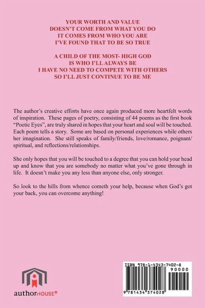 The author's creative efforts have once again produced more heartfelt words of inspiration. These pages of poetry, consisting of 44 poems, are truly shared in hopes that your heart and soul will be touched. Each poem simply tells a story. Some are based on personal experiences, while others on her imagination. She still speaks of family/friends, love/romance, poignant/spiritual, and reflections/relationships. She only hopes that you will be touched to a degree that you can hold your head up and know that you are somebody no matter what you've gone through in life. It doesn't make you any less than anyone else, only stronger. So look to the hills from whence cometh your help, because when God's got your back, you can overcome anything!