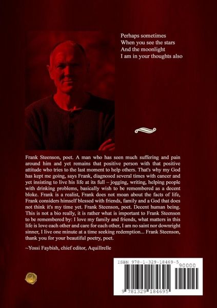 Frank Steenson, poet. A man who has seen much suffering and pain around him and yet remains that positive person with that positive attitude who tries to the last moment to help others. "That's why my God has kept me going," says Frank, diagnosed several times with cancer and yet insisting to live his life at its full - jogging, writing, helping people with drinking problems, basically "wish to be remembered as a decent bloke". Frank is a realist, Frank does not moan about the facts of life, Frank considers himself blessed with friends, family and "a God that does not think it's my time yet". Frank Steenson, poet. Decent human being. This is not a bio really, it is rather what is important to Frank Steenson to be remembered by: "I love my family and friends, what matters in this life is love each other and care for each other, I am no saint nor downright sinner, I live one minute at a time seeking redemption..." Frank Steenson, thank you for your beautiful poetry, poet.