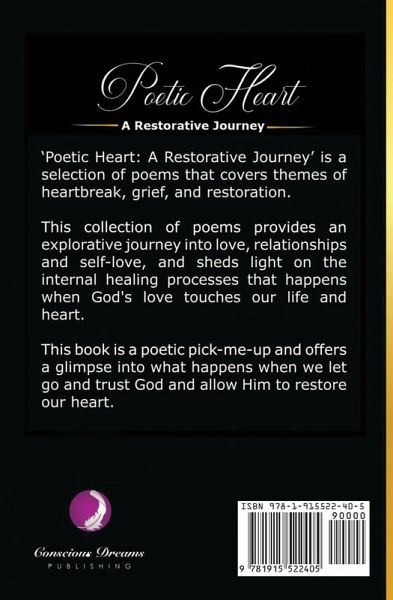 'Poetic Heart: A Restorative Journey' is a selection of poems that covers themes of heartbreak, grief, and restoration. This collection of poems provides an explorative journey into love, relationships and self-love, and sheds light on the internal healing processes that happen when God's love touches our life and heart. This book is a poetic pick-me-up and offers a glimpse into what happens when we let go and trust God and allow Him to restore our hearts.