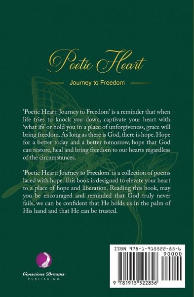 'Poetic Heart: Journey to Freedom' is a reminder that when life tries to knock you down, captivate your heart with 'what ifs' or hold you in a place of unforgiveness, grace will bring freedom. As long as there is God, there is hope. Hope for a better today and a better tomorrow, hope that God can restore, heal and bring freedom to our hearts regardless of the circumstances. 'Poetic Heart: Journey to Freedom' is a collection of poems laced with hope. This book is designed to elevate your heart to a place of hope and liberation. Reading this book, may you be encouraged and reminded that God truly never fails, we can be confident that He holds us in the palm of His hand and that He can be trusted.