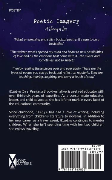 Gladys Dae Weeks delivers an exceptional compilation of poems that stir the spirit and move the soul. Even on her journey to love, she begins with "Stress," demonstrating her internal struggle of all at once exposing her thoughts on the topic while wanting to keep some of herself locked away from the emotional toll of vulnerability.