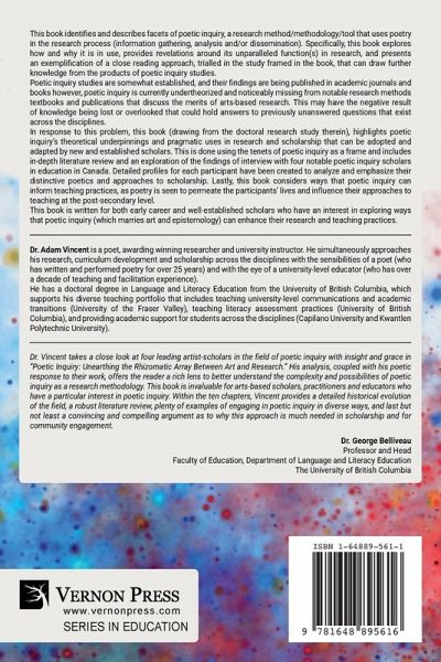 This book identifies and describes facets of poetic inquiry, a research method/methodology/tool that uses poetry in the research process (information gathering, analysis and/or dissemination). Specifically, this book explores how and why it is in use, provides revelations around its unparalleled function(s) in research, and presents an exemplification of a close reading approach, trialled in the study framed in the book, that can draw further knowledge from the products of poetic inquiry studies. Poetic inquiry studies are somewhat established, and their findings are being published in academic journals and books however, poetic inquiry is currently undertheorized and noticeably missing from notable research methods textbooks and publications that discuss the merits of arts-based research. This may have the negative result of knowledge being lost or overlooked that could hold answers to previously unanswered questions that exist across the disciplines. In response to this problem, this book (drawing from the doctoral research study therein), highlights poetic inquiry's theoretical underpinnings and pragmatic uses in research and scholarship that can be adopted and adapted by new and established scholars. This is done using the tenets of poetic inquiry as a frame and includes in-depth literature review and an exploration of the findings of interview with four notable poetic inquiry scholars in education in Canada. Detailed profiles for each participant have been created to analyze and emphasize their distinctive poetics and approaches to scholarship. Lastly, this book considers ways that poetic inquiry can inform teaching practices, as poetry is seen to permeate the participants' lives and influence their approaches to teaching at the post-secondary level. This book is written for both early career and well-established scholars who have an interest in exploring ways that poetic inquiry (which marries art and epistemology) can enhance their research and teaching practices.