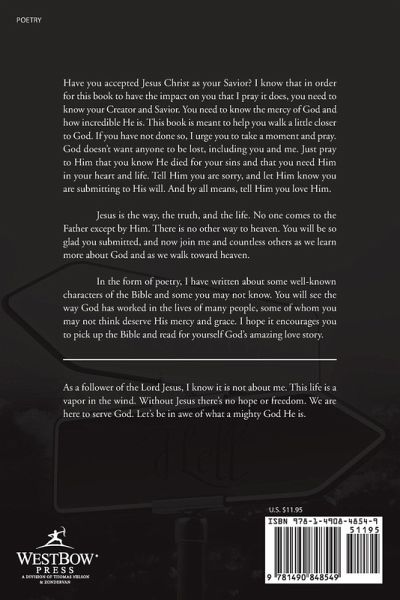 Have you accepted Jesus Christ as your Savior? I know that in order for this book to have the impact on you that I pray it does, you need to know your Creator and Savior. You need to know the mercy of God and how incredible He is. This book is meant to help you walk a little closer to God. If you have not done so, I urge you to take a moment and pray. God doesn't want anyone to be lost, including you and me. Just pray to Him that you know He died for your sins and that you need Him in your heart and life. Tell Him you are sorry, and let Him know you are submitting to His will. And by all means, tell Him you love Him. Jesus is the way, the truth, and the life. No one comes to the Father except by Him. There is no other way to heaven. You will be so glad you submitted, and now join me and countless others as we learn more about God and as we walk toward heaven. In the form of poetry, I have written about some well-known characters of the Bible and some you may not know. You will see the way God has worked in the lives of many people, some of whom you may not think deserve His mercy and grace. I hope it encourages you to pick up the Bible and read for yourself God's amazing love story.