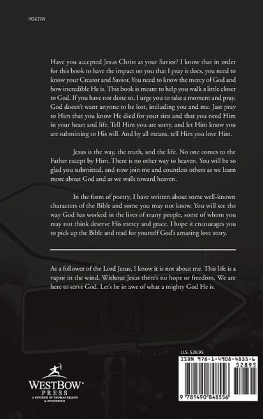 Have you accepted Jesus Christ as your Savior? I know that in order for this book to have the impact on you that I pray it does, you need to know your Creator and Savior. You need to know the mercy of God and how incredible He is. This book is meant to help you walk a little closer to God. If you have not done so, I urge you to take a moment and pray. God doesn't want anyone to be lost, including you and me. Just pray to Him that you know He died for your sins and that you need Him in your heart and life. Tell Him you are sorry, and let Him know you are submitting to His will. And by all means, tell Him you love Him. Jesus is the way, the truth, and the life. No one comes to the Father except by Him. There is no other way to heaven. You will be so glad you submitted, and now join me and countless others as we learn more about God and as we walk toward heaven. In the form of poetry, I have written about some well-known characters of the Bible and some you may not know. You will see the way God has worked in the lives of many people, some of whom you may not think deserve His mercy and grace. I hope it encourages you to pick up the Bible and read for yourself God's amazing love story.