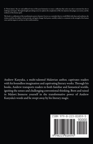 Andrew Kanyuka, a multi-talented Malawian author, captivates readers with his boundless imagination and captivating literary works. Through his books, scripts, essays, poems, and short stories, Andrew transports readers to both familiar and fantastical worlds, igniting the senses and challenging conventional thinking. Born and raised in Malawi, he draws inspiration from his rich cultural heritage to explore themes of identity, social issues, love, and loss. Andrew's commitment to storytelling as a means of provoking thought and leaving a lasting impact is evident in his profound and introspective writings. Immerse yourself in the transformative power of Andrew Kanyuka's words and be swept away by his literary magic.