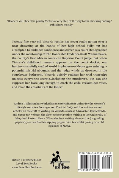 Twenty-five-year-old Victoria Justice has never really gotten over a near drowning at the hands of her high school bully but has attempted to build her confidence and career as a court stenographer under the mentorship of The Honorable Frederica Scott Wannamaker, the county's first African American Superior Court judge. But when Victoria's childhood nemesis appears on the court docket, our heroine's carefully crafted world implodes¿evidence goes missing, a potential mistrial abounds, and the judge winds up drowned in the courthouse bathroom. Victoria quickly realizes her trial transcript unlocks everyone's secrets...including the murderer's. But can she suppress her fears long enough to crack the code, reclaim her voice, and avoid the crosshairs of the killer?