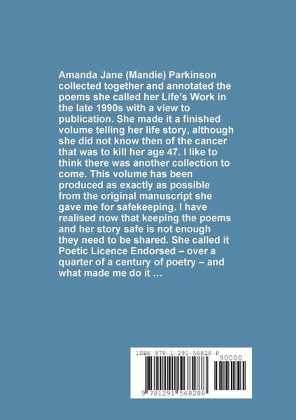 Amanda Jane (Mandie) Parkinson collected together and annotated the poems she called her Life's Work in the late 1990s with a view to publication. She made it a finished volume telling her life story, although she did not know then of the cancer that was to kill her age 47. I like to think there was another collection to come. This volume has been produced as exactly as possible from the original manuscript she gave me for safekeeping. I have realised now that keeping the poems and her story safe is not enough they need to be shared. She called it Poetic Licence Endorsed - over a quarter of a century of poetry - and what made me do it ...