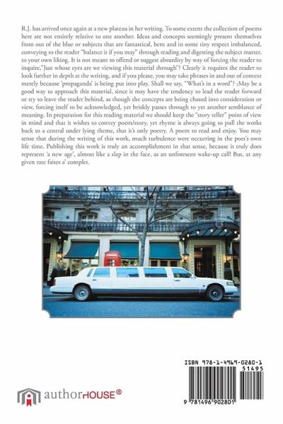 R.J. has arrived once again at a new plateau in her writing. To some extent the collection of poems here are not entirely relative to one another. Ideas and concepts seemingly present themselves from out of the blue or subjects that are fantastical, bent and in some tiny respect imbalanced, conveying to the reader balance it if you may through reading and digesting the subject matter, to your own liking. It is not meant to offend or suggest absurdity by way of forcing the reader to inquire,Just whose eyes are we viewing this material through? Clearly it requires the reader to look further in depth at the writing, and if you please, you may take phrases in and out of context merely because propaganda is being put into play. Shall we say, Whats in a word? ;May be a good way to approach this material, since it may have the tendency to lead the reader forward or try to leave the reader behind, as though the concepts are being chased into consideration or view, forcing itself to be acknowledged, yet briskly passes through to yet another semblance of meaning. In preparation for this reading material we should keep the story teller point of view in mind and that it wishes to convey poem/story, yet rhyme is always going to pull the works back to a central under lying theme, that its only poetry. A poem to read and enjoy. You may sense that during the writing of this work, much turbulence were occurring in the poets own life time. Publishing this work is truly an accomplishment in that sense, because it truly does represent a new age, almost like a slap in the face, as an unforeseen wake-up call! But, at any given rate faites a complet.