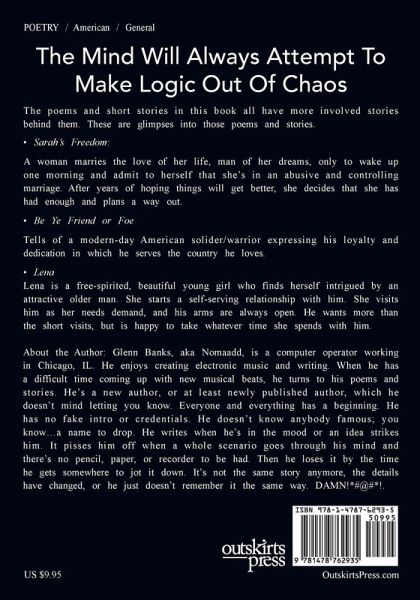 The Mind Will Always Attempt To Make Logic Out Of Chaos. . . The poems and short stories in this book all have more involved stories behind them. These are glimpses into those poems and stories. Sarah's Freedom: A woman marries the love of her life, man of her dreams, only to wake up one morning and admit to herself that she's in an abusive and controlling marriage. After years of hoping things will get better, she decides that she has had enough and plans a way out. Be Ye Friend or Foe: Tells of a modern-day American solider/warrior expressing his loyalty and dedication in which he serves the country he loves. Lena: Lena is a free-spirited, beautiful young girl who finds herself intrigued by an attractive older man. She starts a self-serving relationship with him. She visits him as her needs demand, and his arms are always open. He wants more than the short visits, but is happy to take whatever time she spends with him.