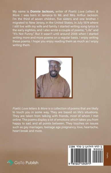 My name is Donnie Jackson, writer of Poetic Love Letters & More. I was born in Jamaica to Mr. and Mrs. Arthur Jackson. I'm the third of seven children, five sisters and one brother. I migrated to New Jersey, in the United States, in July 1974 where I still live with my wife and family. I started writing song lyrics in the early eighties, and I also wrote a couple of poems; "Life" and "It's Not Funny". But it wasn't until around 2006 when I started writing more and more poems on a regular basis. I enjoy writing these poems. I hope you enjoy reading them as much as I enjoy writing them. Poetic Love letters & More is a collection of poems that are likely to touch you in some way. They are based on life's situations. They are taken from talking with friends, most of whom I met online. The poems display a lot of emotions which takes you from happy to sad, and all points between. They touches on issues such as gay marriages, teenage age pregnancy, love, heartache, heart break and more.