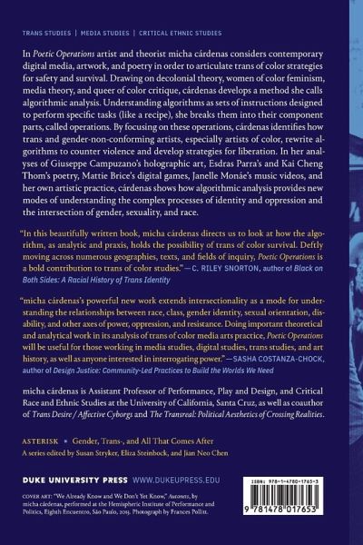 In Poetic Operations artist and theorist micha cárdenas considers contemporary digital media, artwork, and poetry in order to articulate trans of color strategies for safety and survival. Drawing on decolonial theory, women of color feminism, media theory, and queer of color critique, cárdenas develops a method she calls algorithmic analysis. Understanding algorithms as sets of instructions designed to perform specific tasks (like a recipe), she breaks them into their component parts, called operations. By focusing on these operations, cárdenas identifies how trans and gender-non-conforming artists, especially artists of color, rewrite algorithms to counter violence and develop strategies for liberation. In her analyses of Giuseppe Campuzano's holographic art, Esdras Parra's and Kai Cheng Thom's poetry, Mattie Brice's digital games, Janelle Monáe's music videos, and her own artistic practice, cárdenas shows how algorithmic analysis provides new modes of understanding the complex processes of identity and oppression and the intersection of gender, sexuality, and race.
