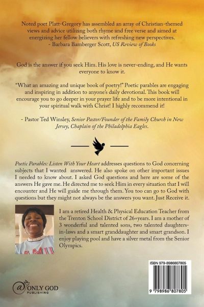 6 Editor's Choice Certificates and a "Poet of Merit" Award from the International Poetic Society. Autobiography:I am a retired Health & Physical Education Teacher from the Trenton School District of 26+years. I am a mother of 3 wonderful and talented sons, two talented daughters-in-law, and a smart granddaughter and smart grandson. I enjoy playing pool and have a silver medal from the Senior Olympics. Book synopsis:This book addresses questions to God concerning subjects that I wanted answered. He also spoke on other important issues I needed to know about. I asked God questions and here are some of the answers He gave me. He directed me to seek Him in every situation that I will encounter and He will guide me through them. You too can go to God with questions but they might not always be the answers you want. Just Receive it.