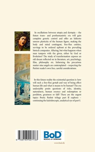 The subject of post- and transhumanism is a pending area of interest that demands reflection, as the coming biotech era inevitably will change human life.The essay trilogy offers a vivid and comprehensible insight into the discourse through the different cultural angles of literature, art, film, philosophy, religion and science, enlightening newcomers as well as those already familiar with the topic.Poetic Parloir is dedicated to - and thus suitable for - the reader who wants to be well versed in the pivotal questions of contemporary life. The taken view is philosophical; the context is literature, art, film, philosophy, religion and science; and the intention is the impartial presentation that captures the complexity of post- and transhumanism.At a first glance, post- and transhumanism has a futuristic aura, hence, if one were to speak of such an era it would be a future one or merely a fictive sci-fi scenario. However, this is not the case and critics argue that we already livein a post- and transhumanistic age. A conviction Poetic Parloir endorses, or at least the view that the biotech revolution will prevail, and certainly the view that it will have a great impact on human existence and mankind, changing our understanding of what it means to be a human and to live a human life. The situation calls for moral attention, as the new biotechniques evolve at a far higher pace than ethics can keep up with.New times are descending, some say the promised land, the Millennial Kingdom from the Book of Revelation. I say, it is a rabbit hole and we are invited whether we like or not, with Alice, either into the wonderland of utopia or the gloomy wasteland of dystopia.Dear reader, I hereby give you Poetic Parloir [part II] on the topic of post- and transhumanism. Yours to read, yours to roam - yours to revel in.