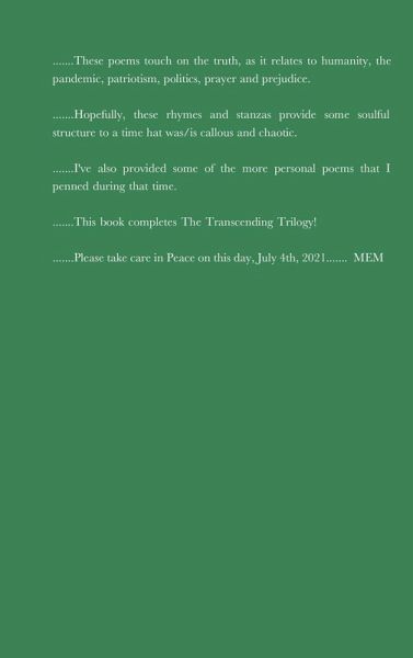 .......These poems touch on the truth, as it relates to humanity, the pandemic, patriotism, politics, prayer and prejudice. .......Hopefully, these rhymes and stanzas provide some soulful structure to a time that was/is callous and chaotic. .......I've provided some of the more personal poems that I penned during that time. .......This book completes The Transcending Trilogy! .......Please take care in Peace on this day, July 4th, 2021....... MEM