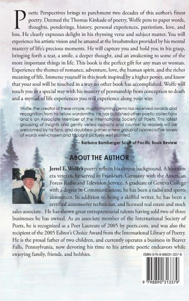 Poetic Perspectives brings to parchment two decades of this author's finest poetry. Deemed the Thomas Kinkade of poetry, Wolfe pens to paper words, thoughts, ponderings, history, personal experiences, patriotism, love, and loss. He clearly expresses delight in his rhyming verse and subject matter. You will experience his artistic vision and be amazed at the brushstrokes provided by his mental mastery of life's precious moments. He will capture you and hold you in his grasp, bringing forth a tear, a smile, a deeper thought, and an awakening to some of the more important things in life. This book is the perfect gift for any man or woman. Experience the themes of romance, adventure, love, the human spirit, and the richer meaning of life. Immerse yourself in this work inspired by a higher power, and know that your soul will be touched in a way no other book has accomplished. Wolfe will touch you in a special way with his mastery of penmanship from conception to death and a myriad of life experiences you experiences along your way.
