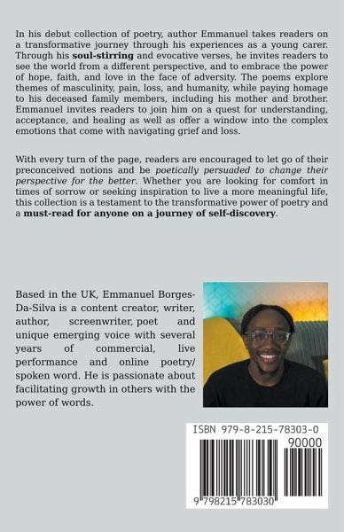 Can light shine from the darkness of disability? Is there anything to gain from a life of being a young carer? Is there hope for any of us? This book may give some answers. "Poetic Persuasion: The Young Carer's Ink" is a collection of poetry written by Emmanuel Borges-Da-Silva, a former young carer. The poems within this collection capture the experiences of young carers, individuals who take on significant caring responsibilities for a family member or loved one who is ill or disabled. In addition, Emmanuel paints an intimate portrait of the human experience by delving into topics such as grief, hope, love, masculinity and faith in God. Written in a compelling and accessible style, the book champions a series of poems that are both beautiful and heartbreaking. The poems are filled with inspiring, uplifting words which will bring about inner strength and resilience, as well as a sense of empowerment. This collection is a moving and thought-provoking read for anyone who has ever been a young carer, known a young carer, and anyone who has ever known hardship, loss, love and hope, which should be everyone. There's a little something in here for everyone. With every turn of the page, readers are encouraged to let go of their preconceived notions and be poetically persuaded to change their perspective for the better. Whether you are looking for comfort in times of sorrow or seeking inspiration to live a more meaningful life, this collection is a testament to the transformative power of poetry and a must-read for anyone on a journey of self-discovery. This is Emmanuel's tribute to his upbringing, his family, himself and to you. This was made for you.